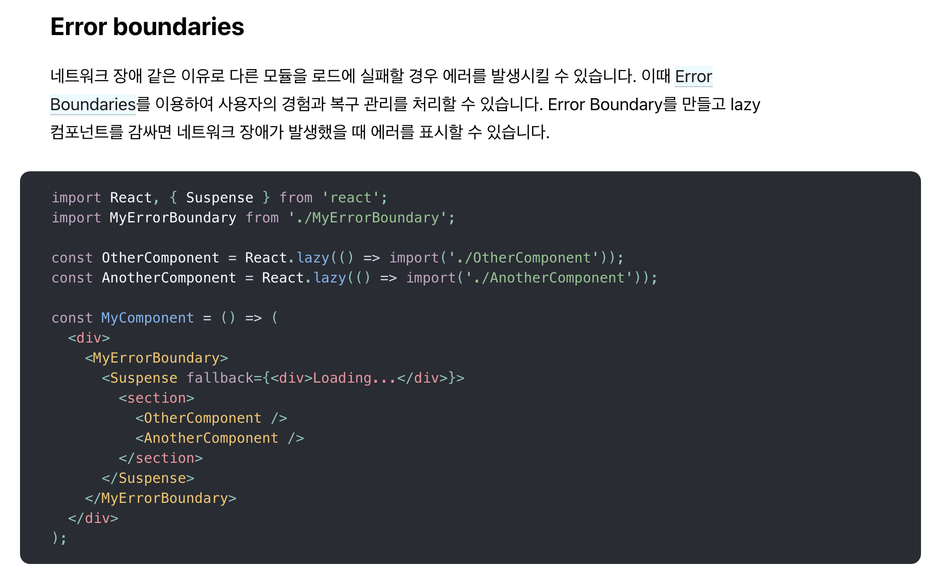 리액트 공식 문서에서도 설명하고 있듯이, 레이지 로딩을 사용하는 코드를 ErrorBoundary로 감싸서 청크 로딩 실패 여부를 해당 바운더리에서 감지한다.