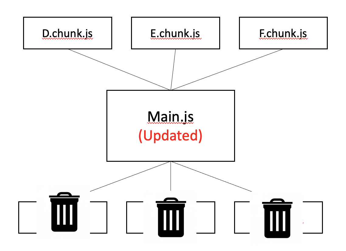 A,B,C 청크는 삭제되고 업데이트된 Main.js에서는 D,E,F 청크를 사용하는데,