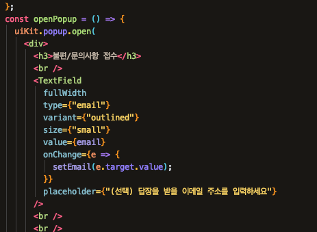 Popup Component에는 아무런 일도 일어나지 않아 아무리 키보드를 눌러도 위의 value={email}은 초기값에서 변하지 않게 된다.