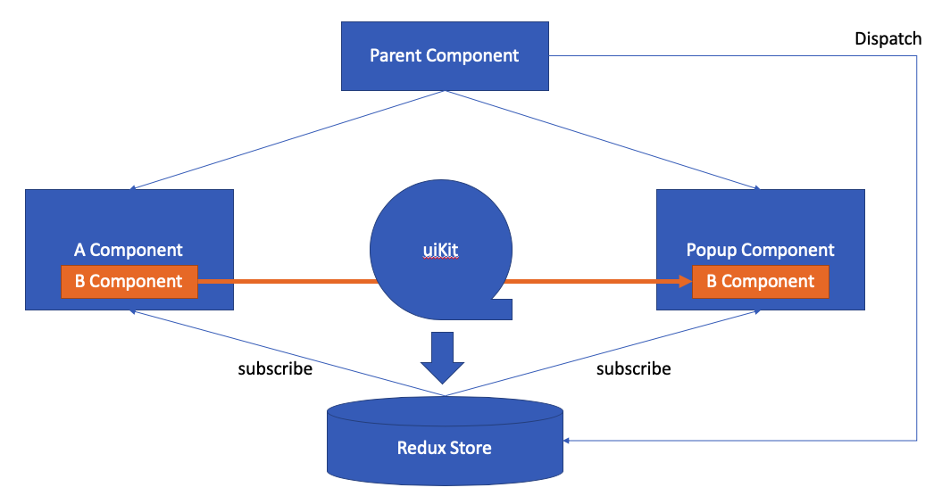 A Component와 Popup Component가 해당 리덕스 스토어를 구독하는 구조에서