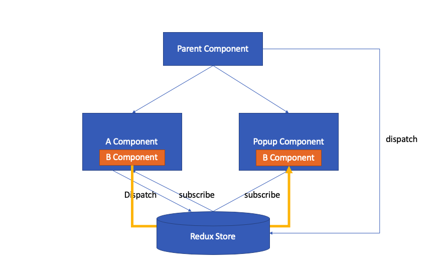 redux에서 하라는 대로, B Component에 대해 디스패치함으로써 store의 state가 업데이트되고 Popup Component가 자동으로 이를 알아차리게 하는 방법이다.