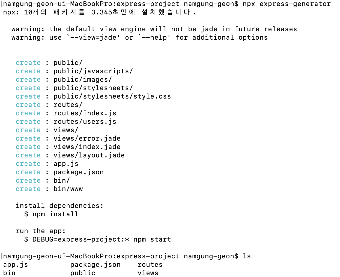 그 후, npx express-generator를 이용해 해당 폴더를 express 프로젝트로 초기화한다