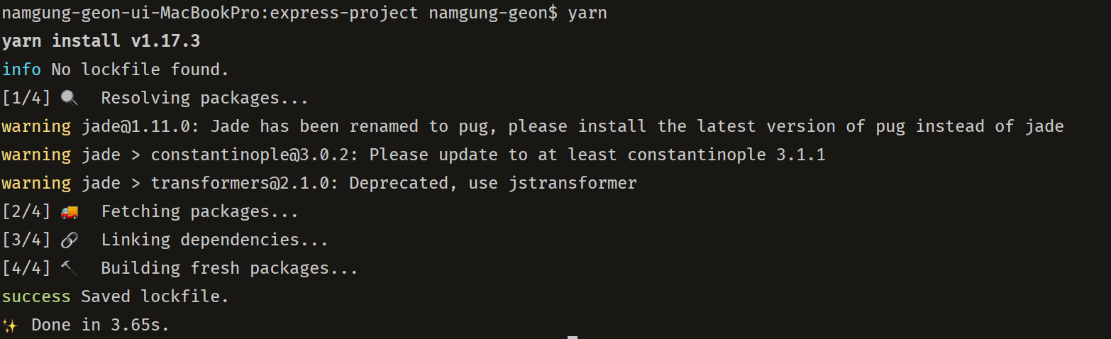 설정된 dependencies를 로드하기 위해서 yarn 을 입력해 해당 모듈들을 설치해준다.