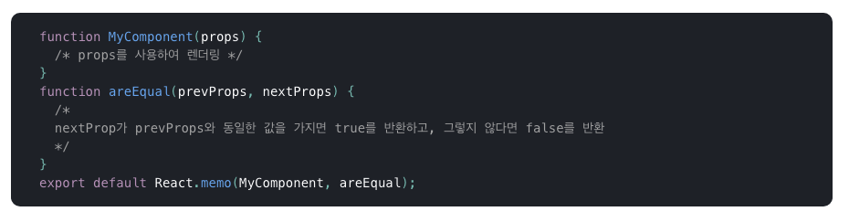 함수를 전달할 경우, 해당 함수에는 이전 Props와 다음 Props가 전달되고 해당 값을 비교하여 리렌더링이 필요한지 아닌지를 나타내주면 된다.
