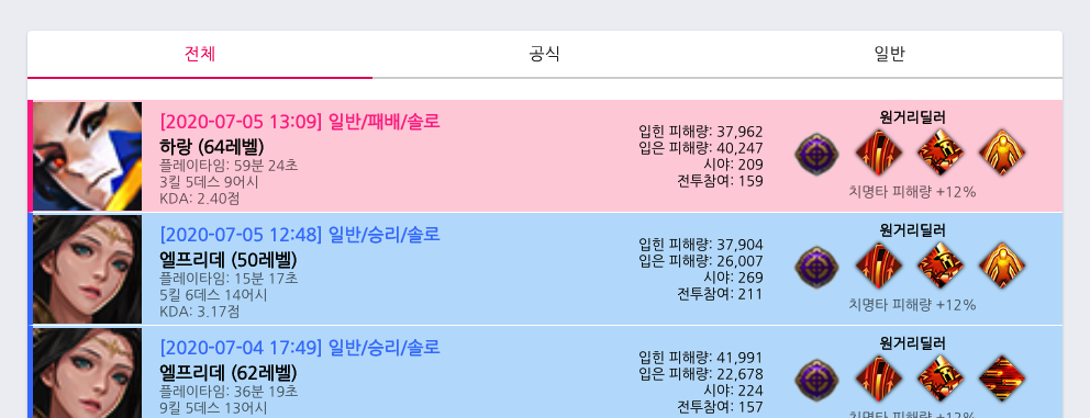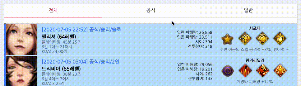 (탭바 바디 내의 게임 로그는 각각 최대 200, 100, 100개가 들어있다)