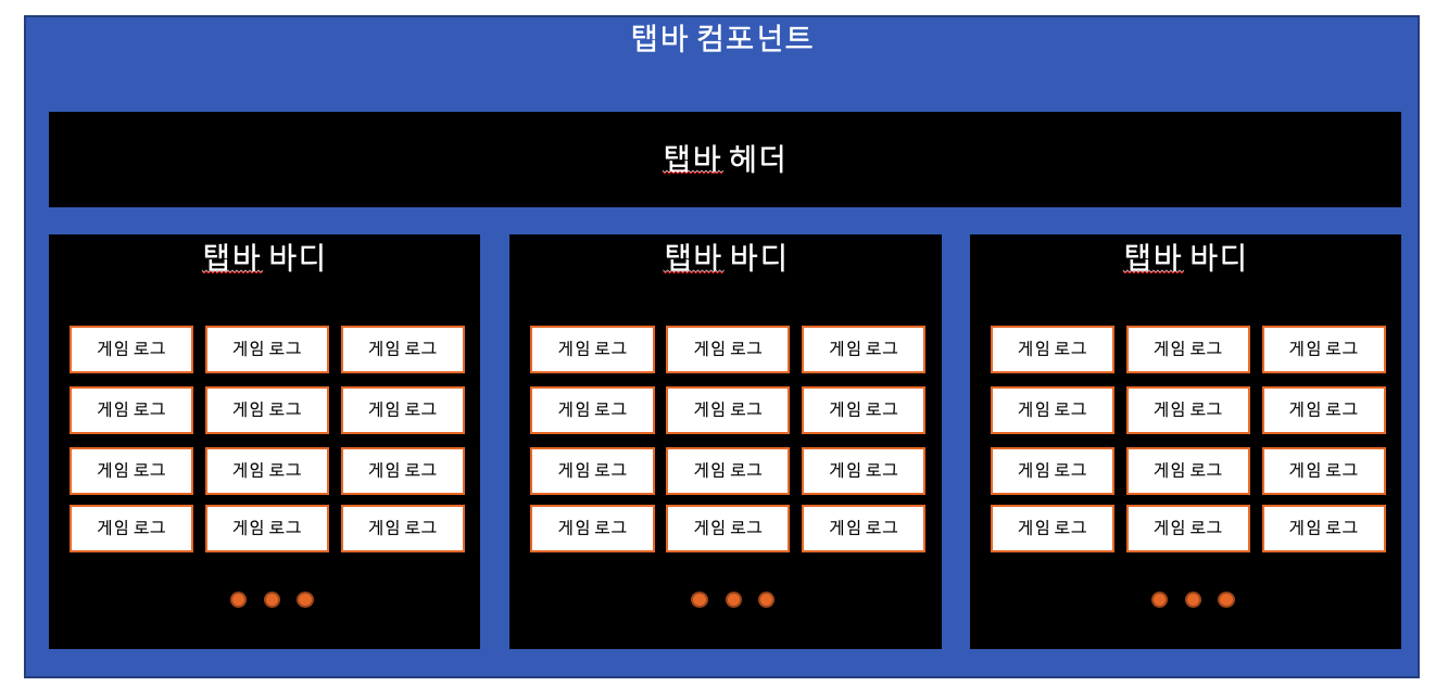 탭바 컴포넌트가 전체 내용을 감싸고 있으며, 탭바 헤더에서 어떤 탭을 누르면 그 탭에 해당하는 바디를 골라 visible상태로 만들고