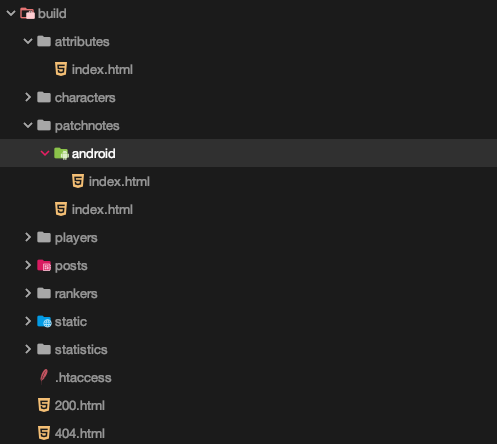 이후 yarn build를 실행하면 빌드를 완료한 후 react-snap이 실행되고 해당 작업이 끝나면 /build에서 다음과 같은 모습을 볼 수 있다