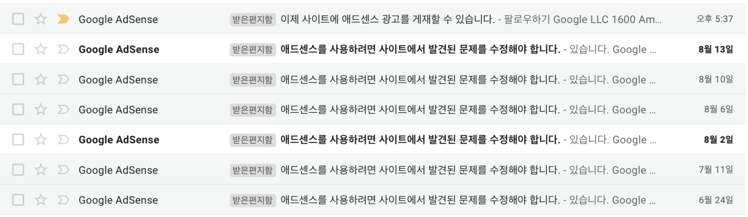 6번의 떨어짐 끝에 드디어 애드센스 합격 통보를 받았다.