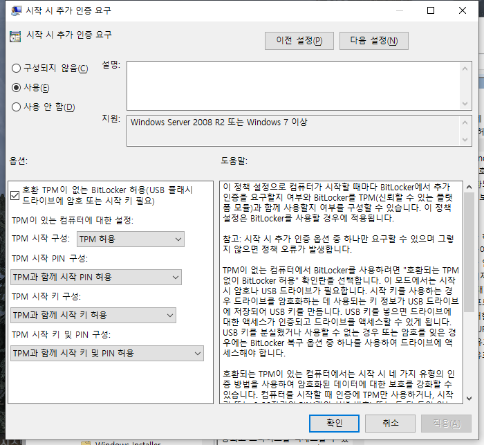 시작 시 추가 인증 요구 항목을 "사용"으로 바꾼다.
