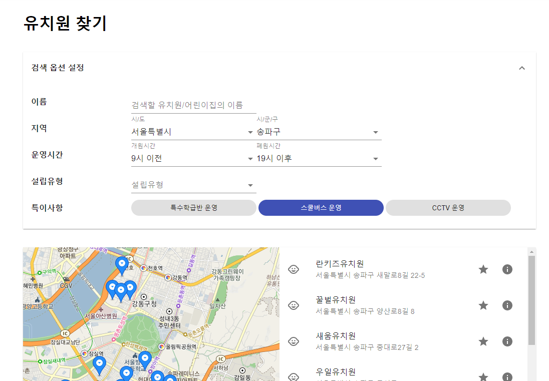 지역과 설립유형, 운영시간, 특수학급반 운영, 스쿨버스 운영, CCTV 운영 여부를 필터링할 수 있게 제작했습니다.