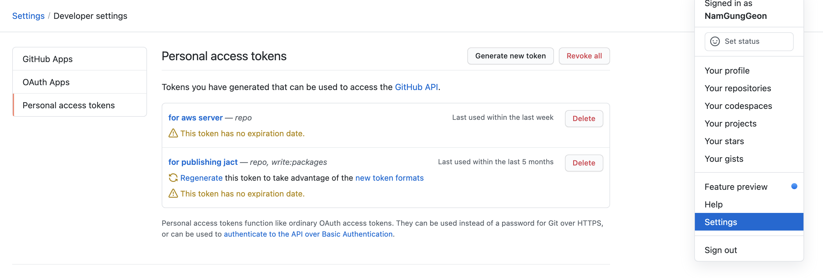 깃헙에서 Settings-> Developer settings-> Personal access tokens 로 들어간 다음
