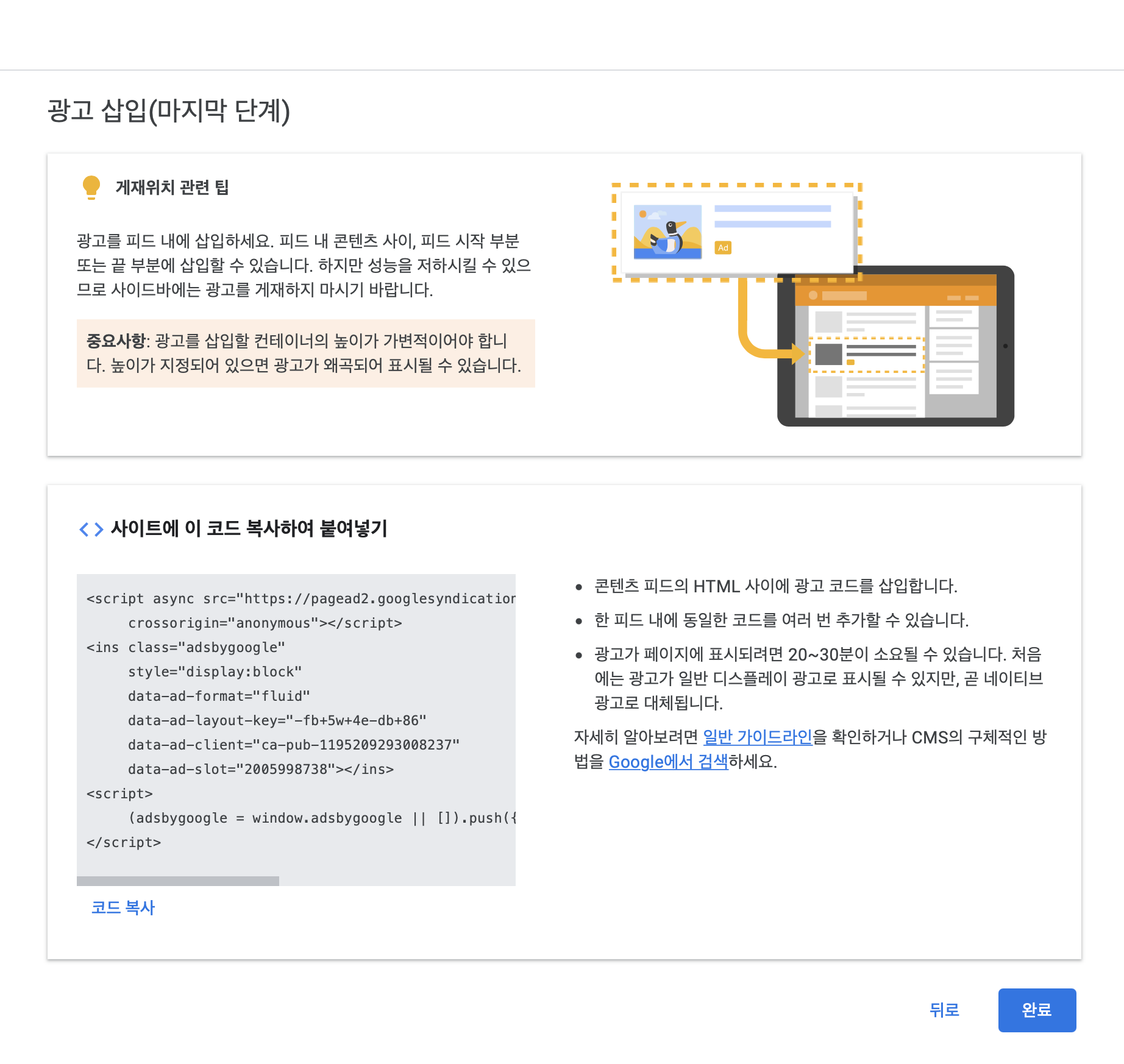 그러면 이제 광고 삽입에 필요한 스크립트를 제공받는다.