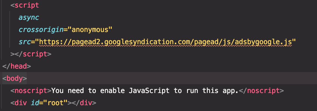 이 중 맨 위의 <script async ....></script> 부분을 먼저 public/index.html에 추가한다.