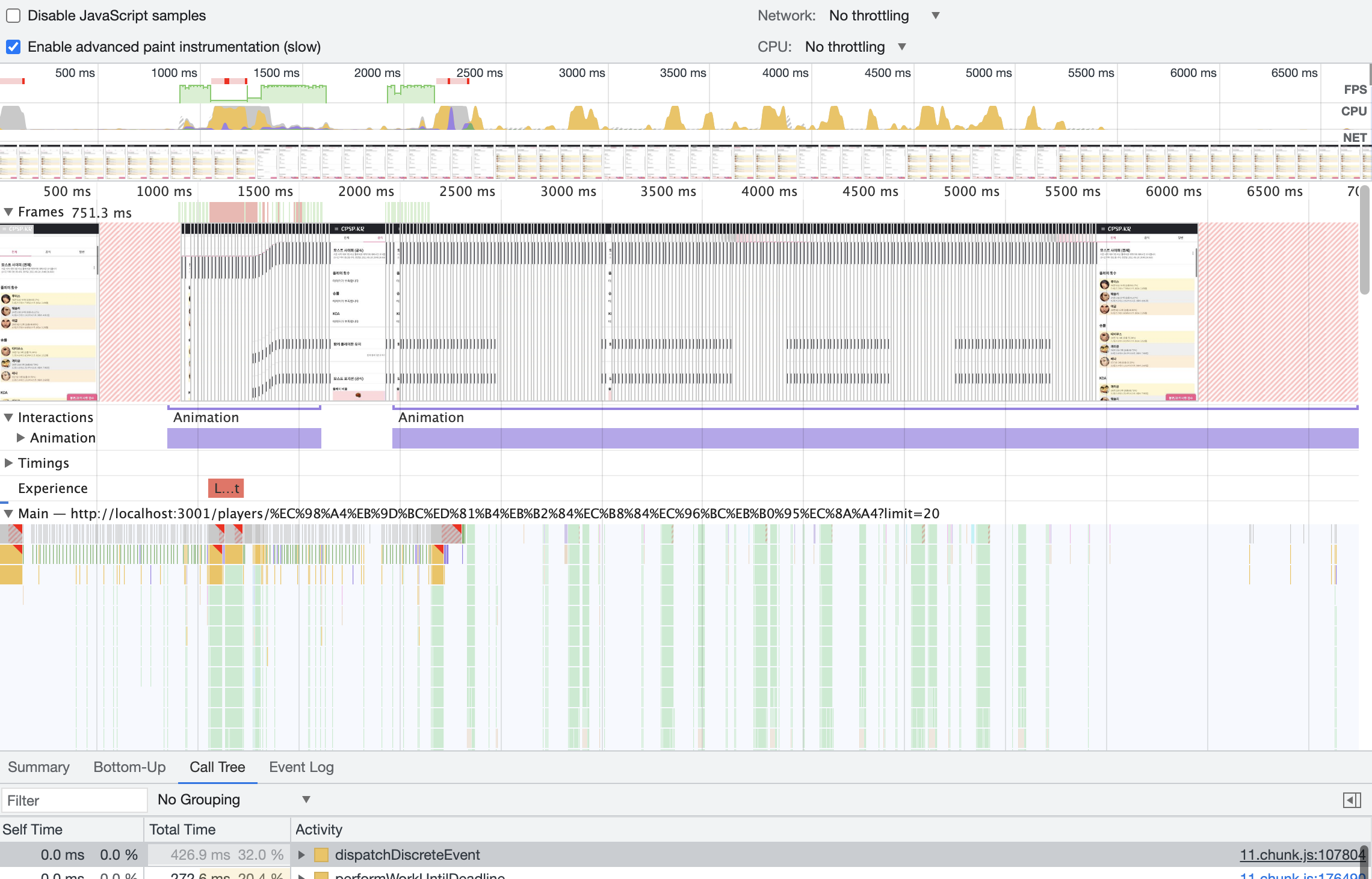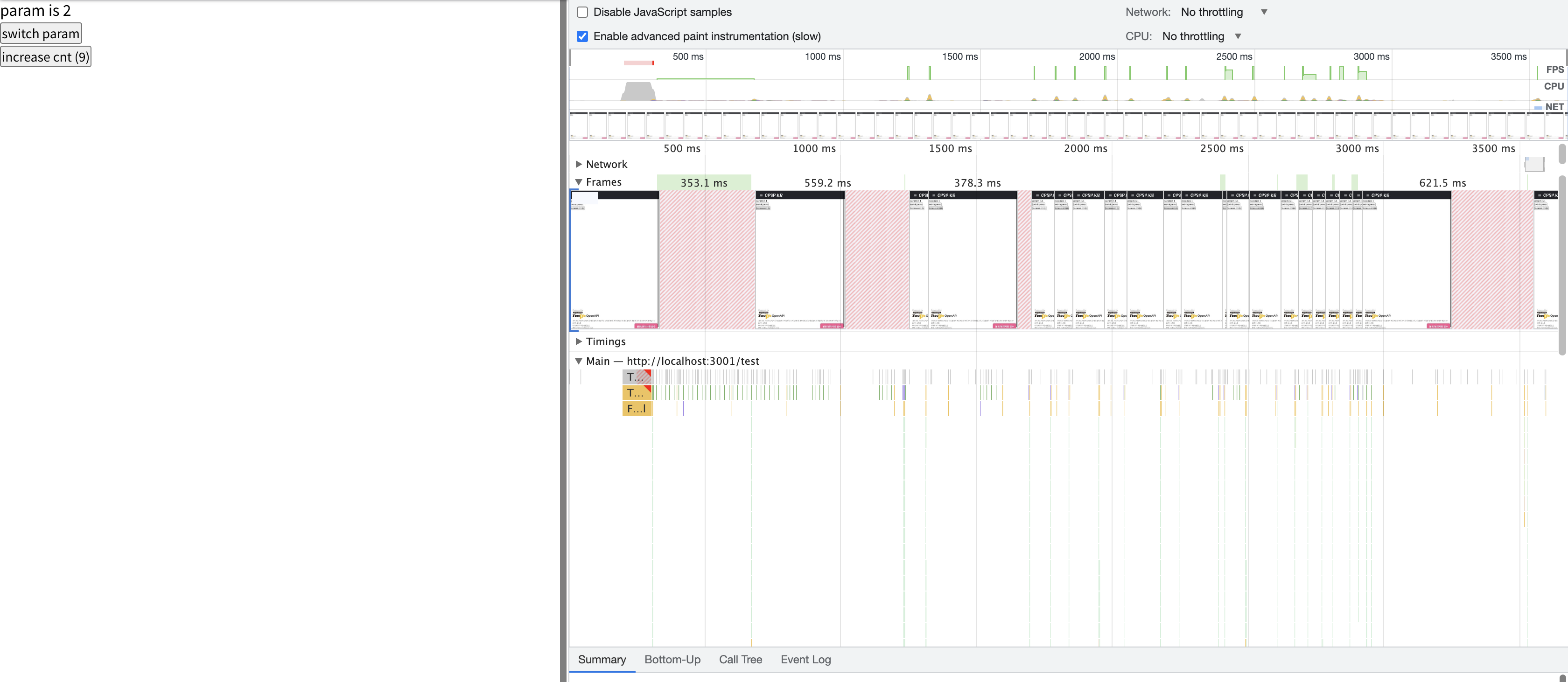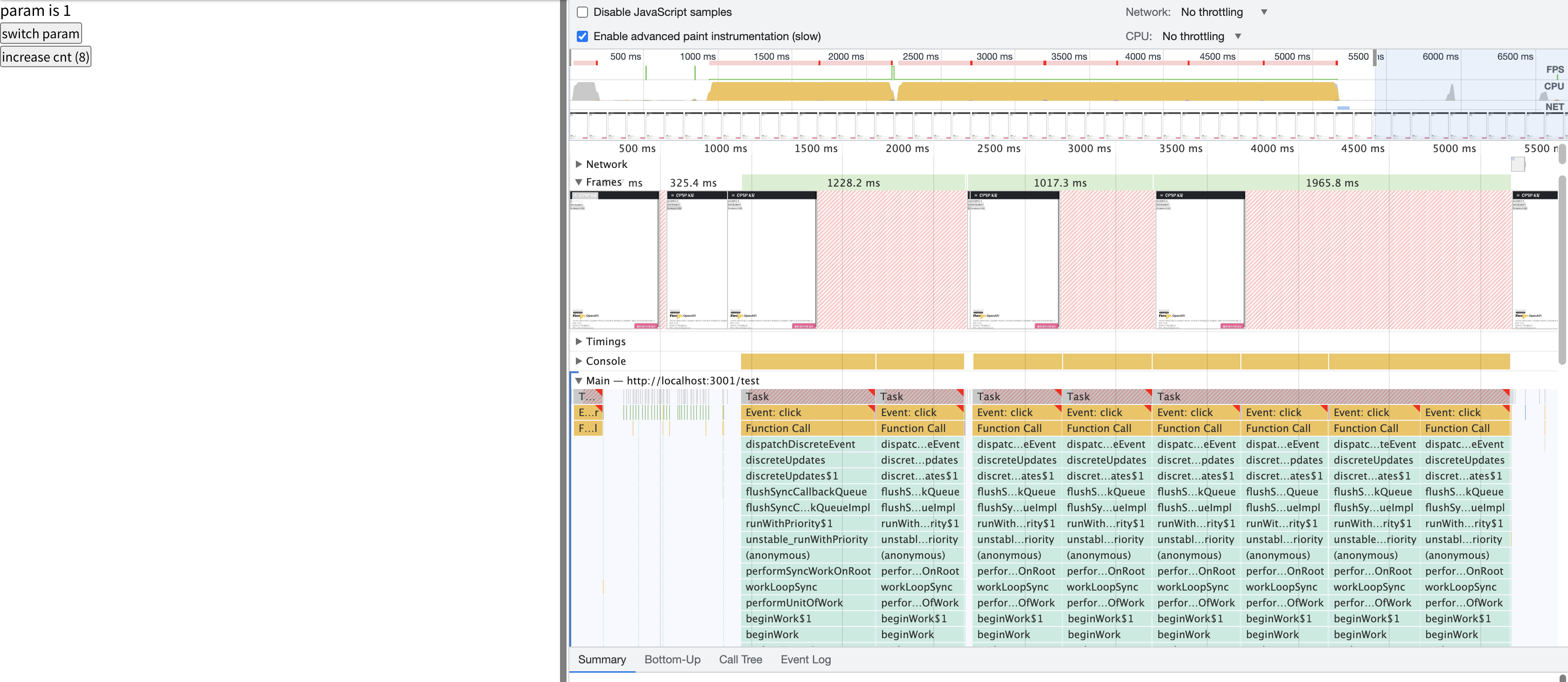 실제로 퍼포먼스 도구로 측정해본 결과 foo(param)을 계산하는데 매우 오랜시간이 걸리고 그 동안 프레임이 매우 낮아진다.