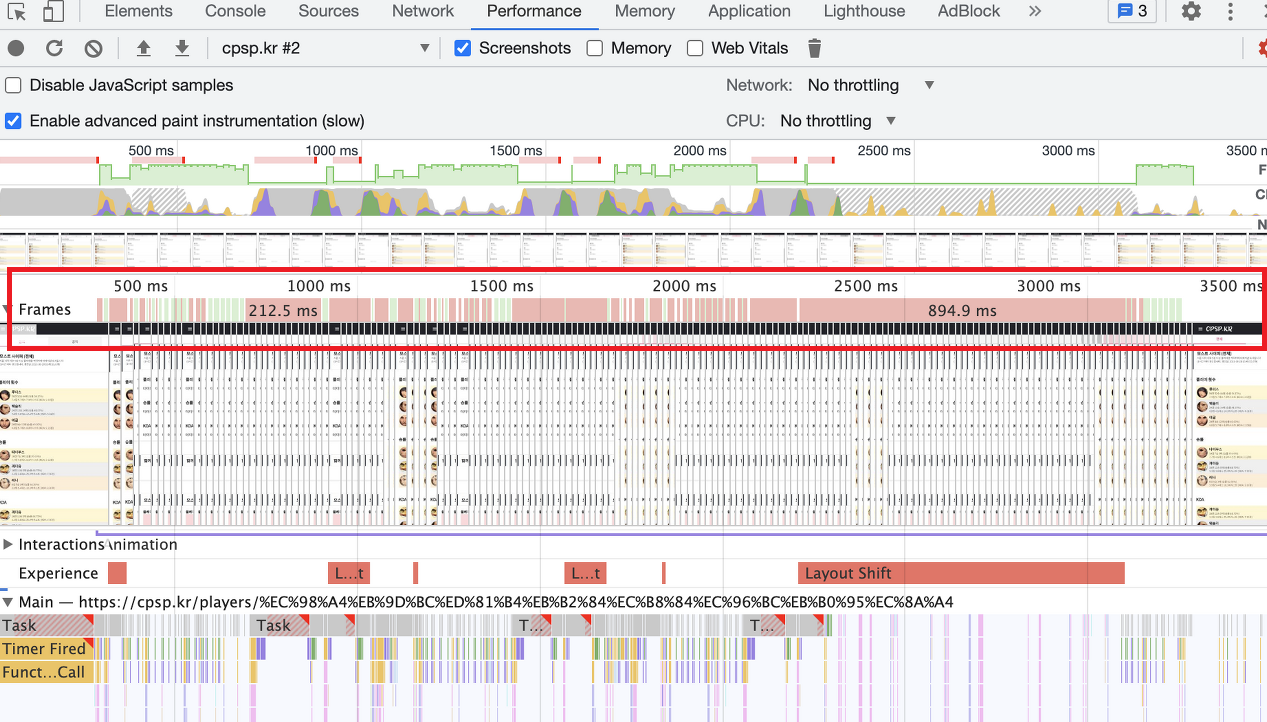 (Frame이 급격히 줄어드는 구간=> Frames가 붉게 표시되는 구간)