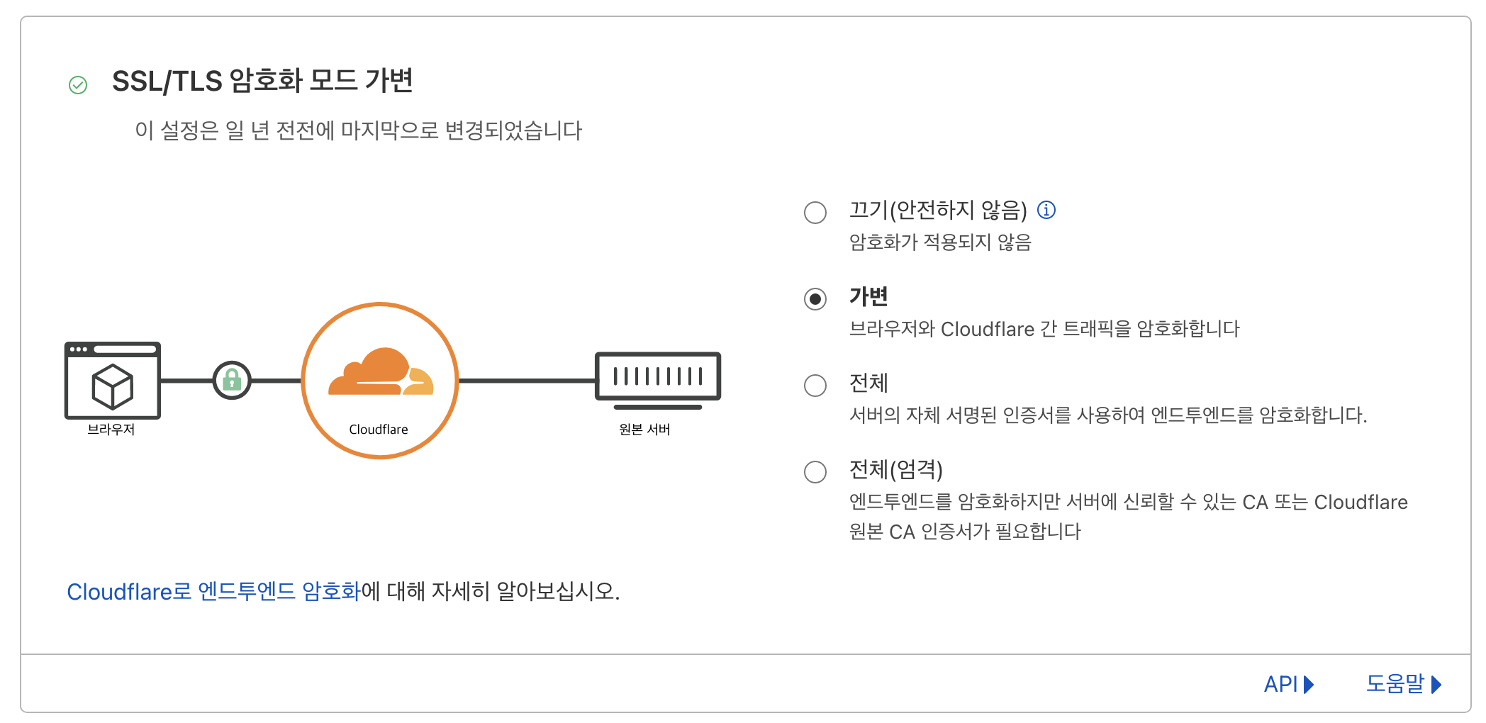 클라이언트와 cloudflare간 통신은 암호화되지만 cloudflare와 원본 서버(내 서버)의 통신은 평문으로 이루어진다.