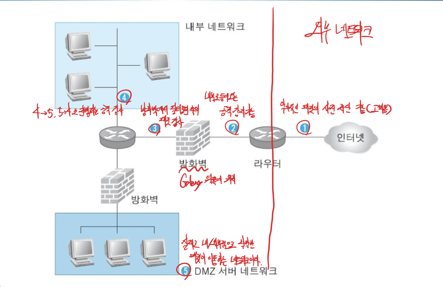 5(서버쪽 내부 네트워크): 불특정 다수에 의해 실제 외부에서 들어온 패킷이 들어오고, 다시 나가는 패킷이 이동하며, 각 시스템에 중요한 데이터들이 존재하기 때문에 보안이 매우 중요하다.