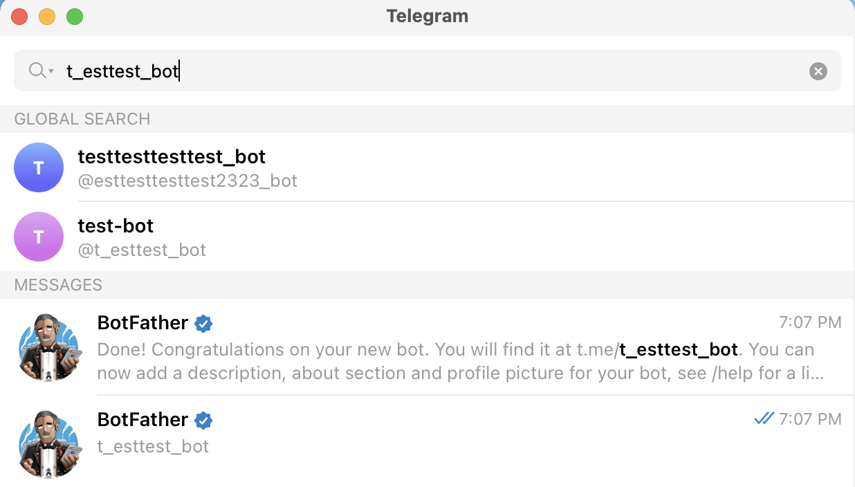 두 번째 이름은 t_esttest_bot 으로 했다.