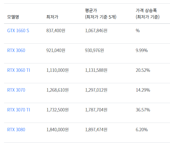 일반적인 사용자에게 맞춰진 3060과 3060ti를 보면 92만, 111만원에 가격이 형성되어 있다.
