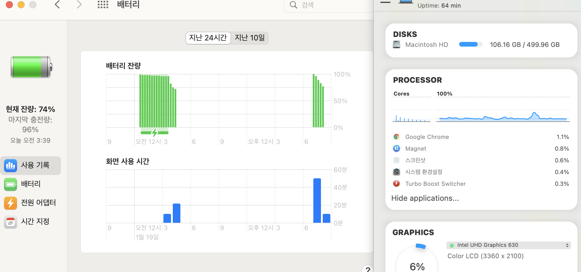 1시간정도(64분) 사용하니 배터리가 26% 소모되었다.