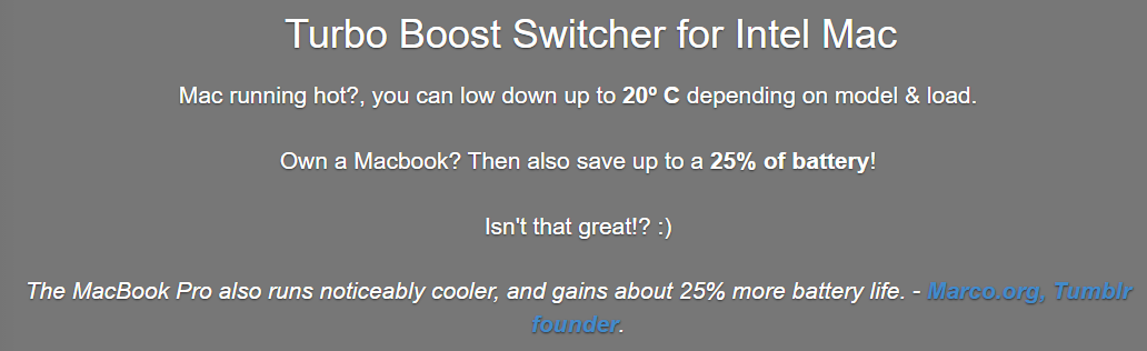 Turbo Boost Switcher for Intel Mac Mac running hot?, you can low down up to 20º C depending on model & load. Own a Macbook? Then also save up to a 25% of battery! Isn't that great!? :) The MacBook Pro also runs noticeably cooler, and gains about 25% more