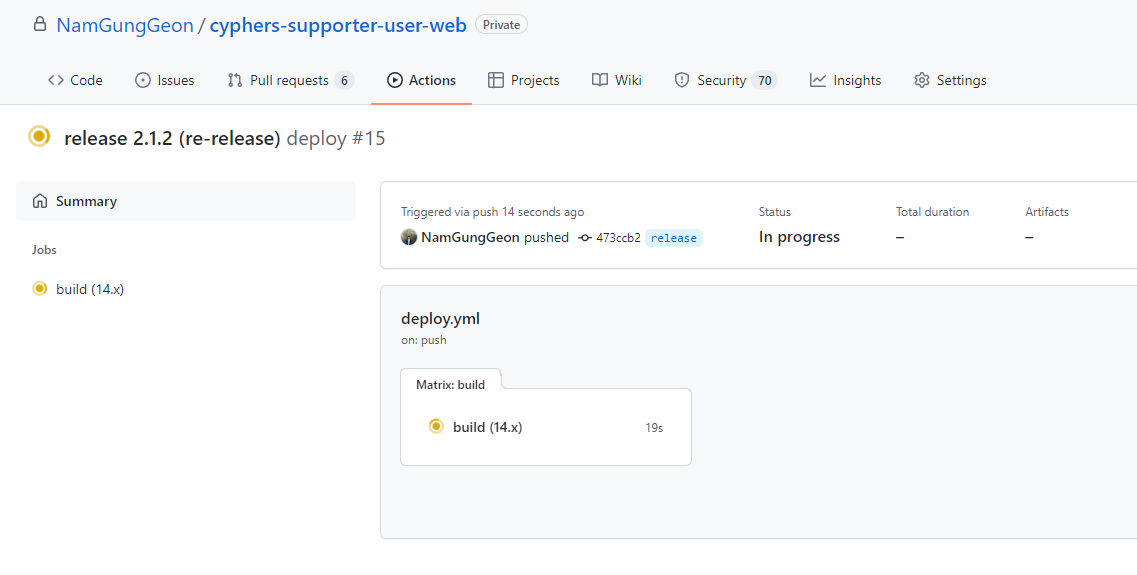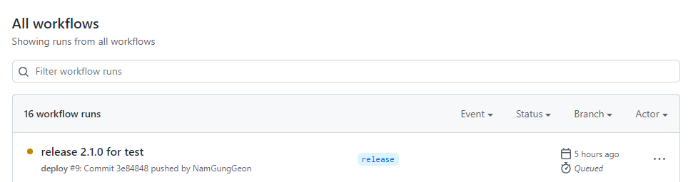 runs-on을 바꾸자마자 바로 in progress 상태가 되었다.