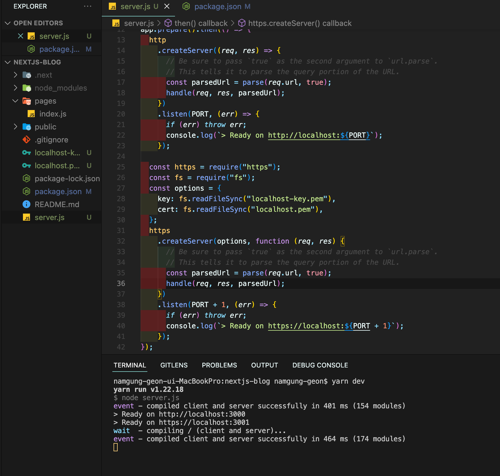 이제 yarn dev를 입력하면, 아래와 같이 성공적으로 localhost에 http, https로 접근할 수 있다.