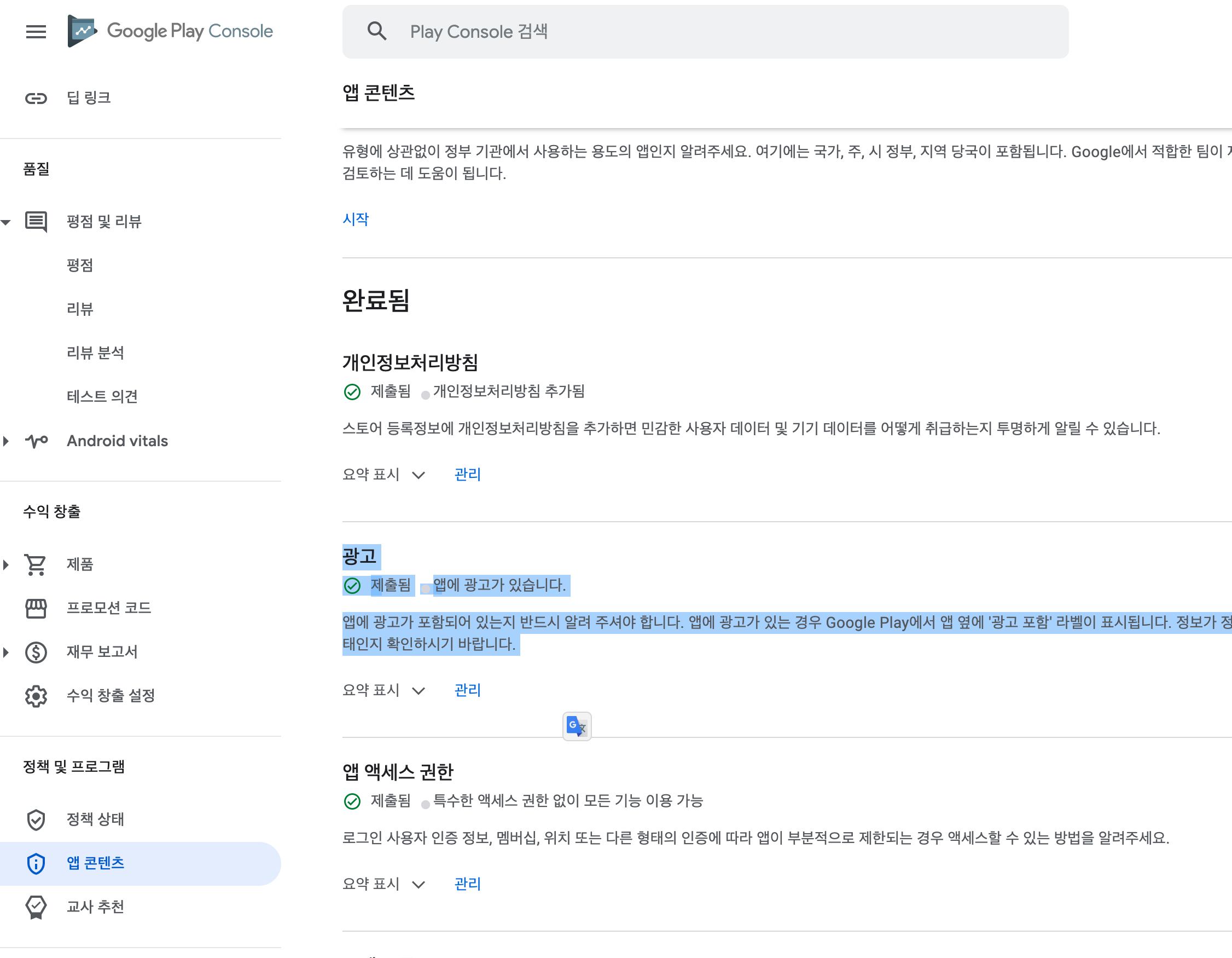 구글 플레이 콘솔> 대상 앱> 정책 및 프로그램> 앱 콘텐츠> 광고 에서 설문에 답한다.