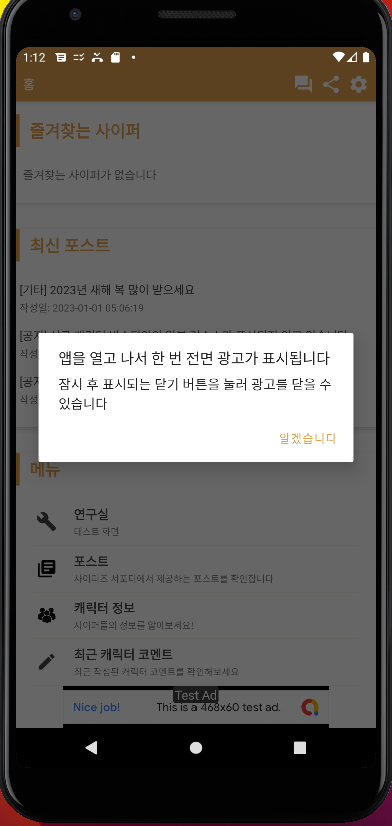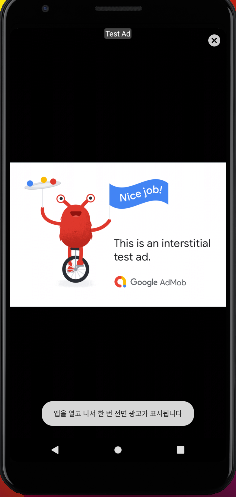 이 광고는 테스트 전면 광고라 토스트 메시지가 직접 가리지는 않지만,