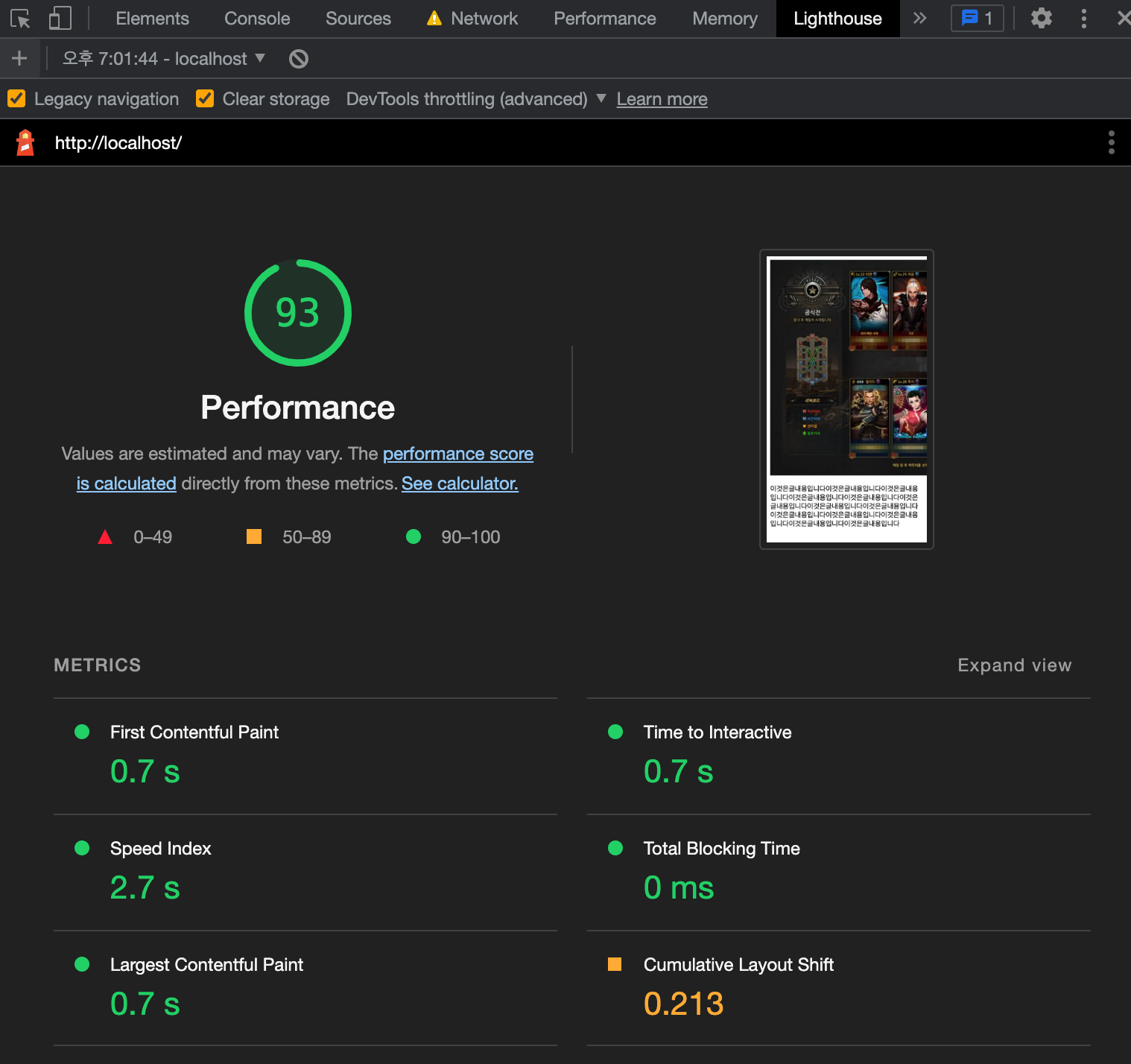 크롬 개발자 도구의 lighthouse 를 이용해 측정할 수 있다.