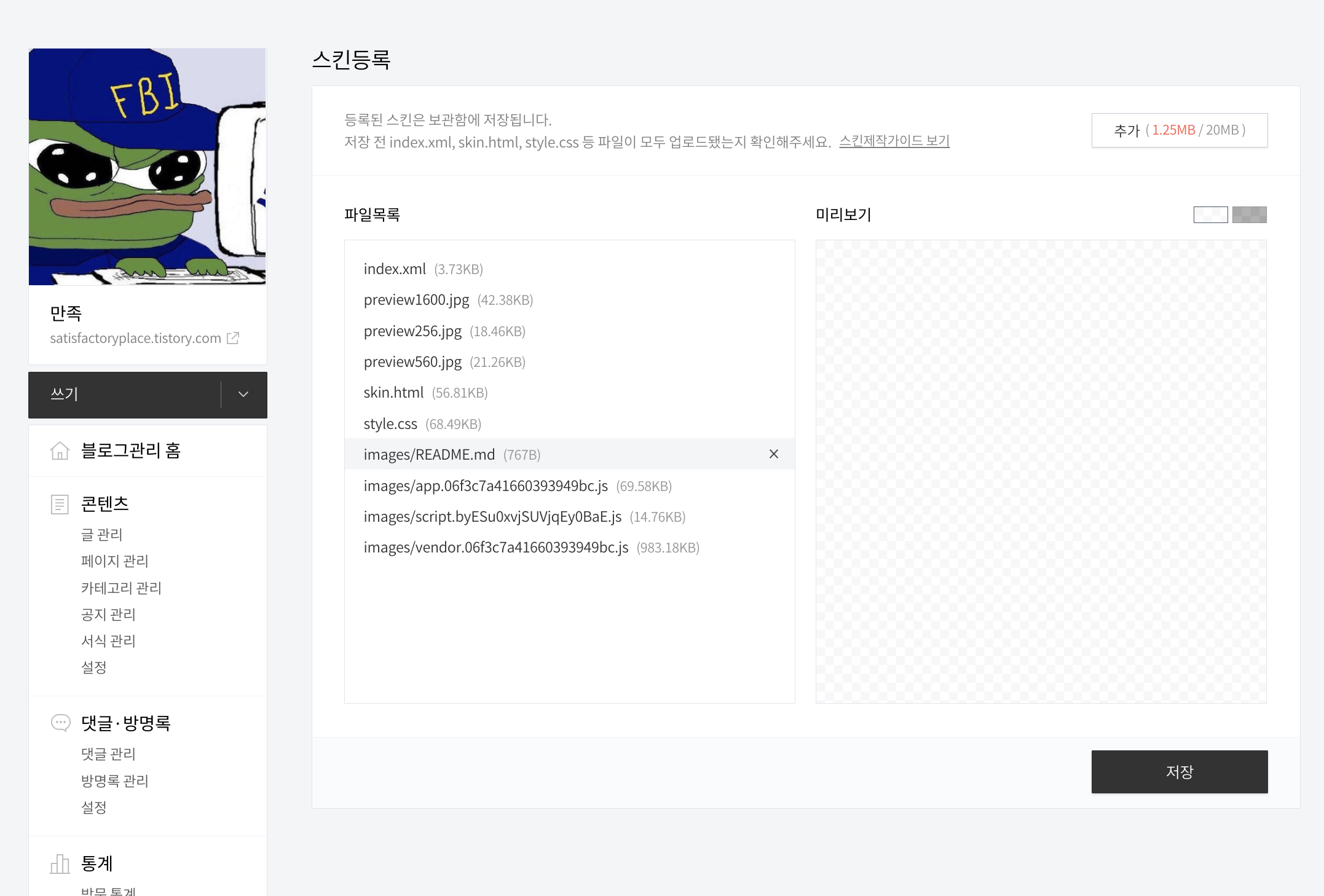관리자 메뉴로 들어가서, 스킨 변경-> 스킨 등록 버튼을 클릭한다.
