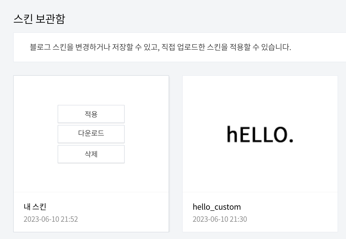 저장해주고, 스킨 보관함으로 이동하면 방금 저장한 스킨을 적용할 수 있다.