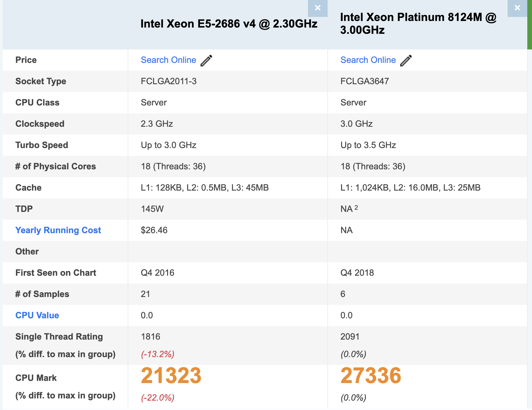정보가 많지는 않지만 연식, 베이스/터보 클럭 스피드, 캐시 크기, 단일 스레드 점수등 모든 부분에서 8124M이 앞서고 있다.
