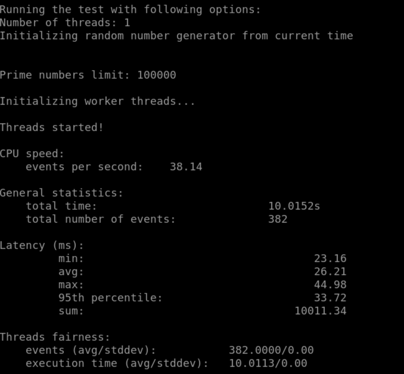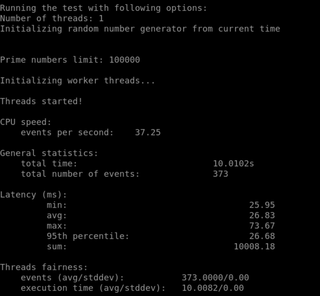 sysbench --test=cpu --cpu-max-prime=100000 --num-threads=1 run