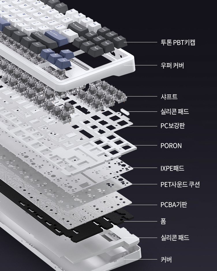4만원 대에서는 나올 수 없는 풀윤활, 흡음처리와 중독적인 타건감이 일품인 키보드이다.