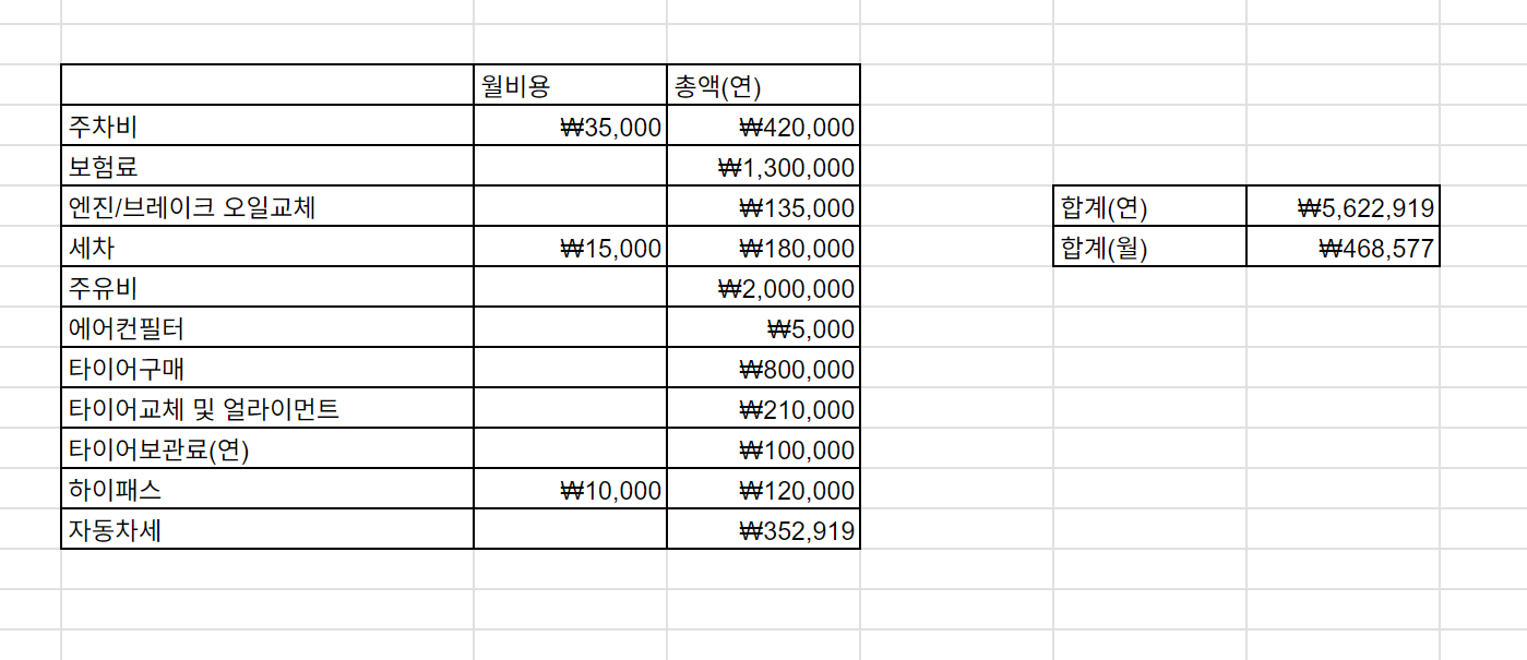 차량 구매 첫 해라 타이어구매에 꽤 많은 비용이 발생했는데, 타이어 구매비를 빼도 한 달에 약 40만원이 사용된다.