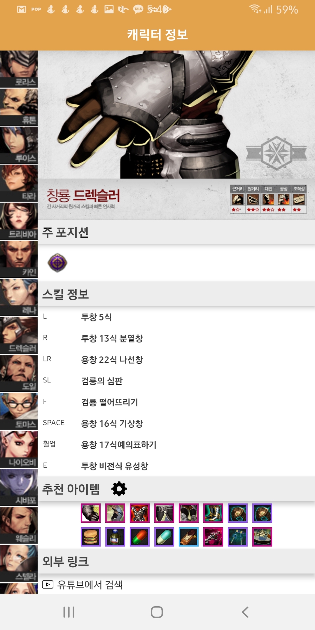 모든 캐릭터에 대해, 주요 포지션/스킬 정보/추천 아이템(티어별)/외부 링크(유튜브, 나무위키 등)의 정보를 제공합니다.