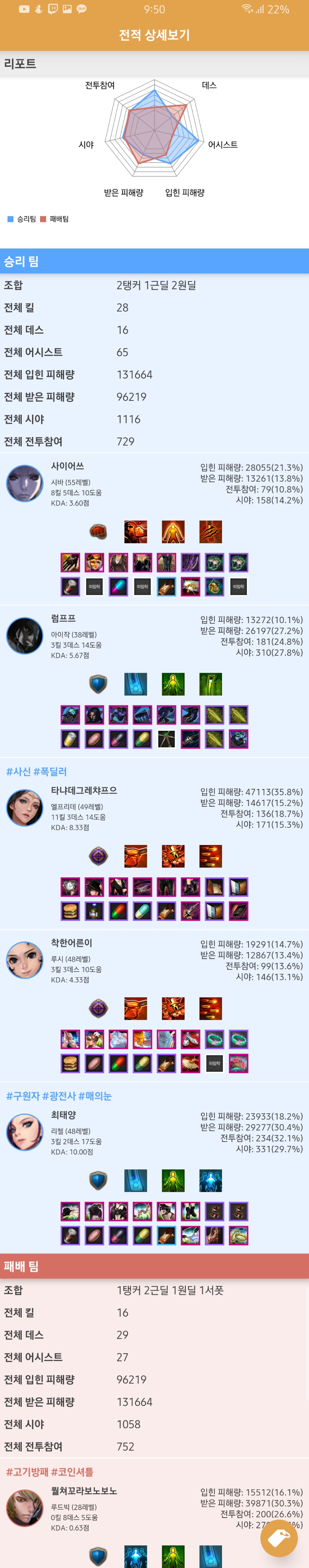 각각의 유저마다 어떤 아이템을 착용했는지, 어떤 특성을 들었는지, 딜은 얼마나 했는지를 확인할 수 있으며