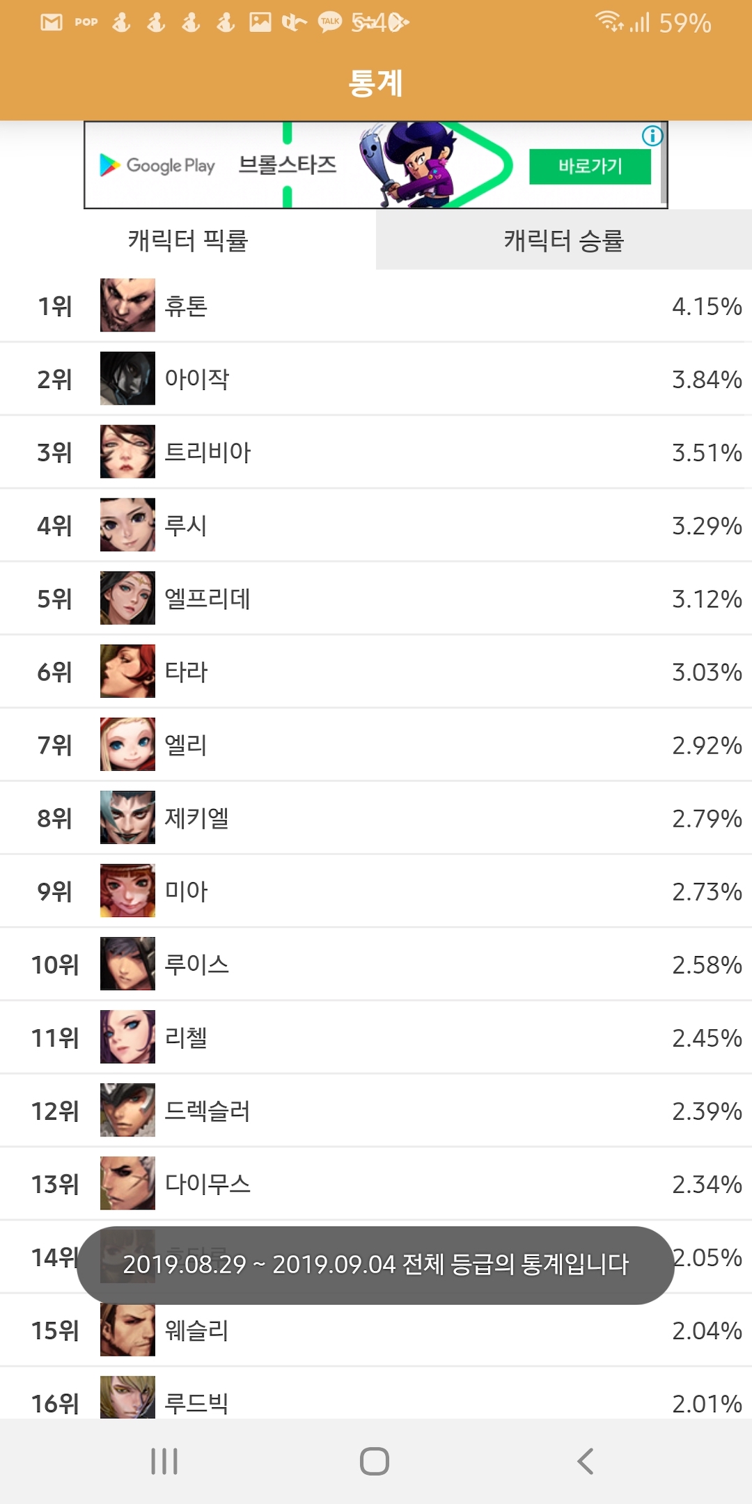 캐릭터 별 승률/픽률을 알아볼 수 있습니다.
