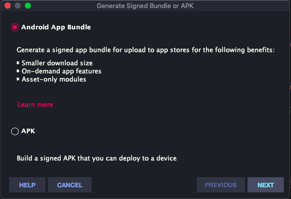 결과물을 aab파일로 내보낼지, apk로 내보낼지를 선택한다.
