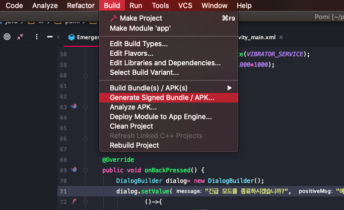안드로이드 스튜디오를 키고, Build-> Generate Signed Bundle/APK를 누르자