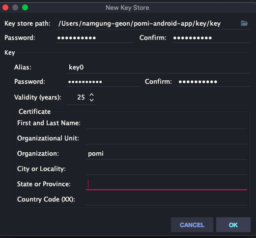 key store password, key alias, key password는 까먹으면 나중에 아주아주 곤란해지니