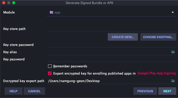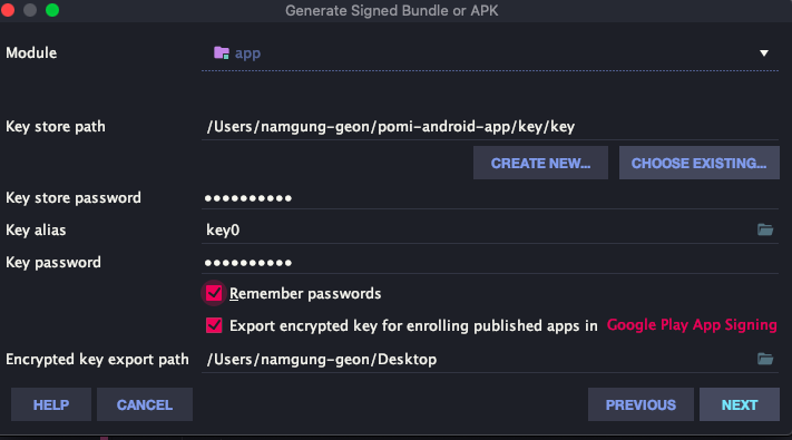 맨 밑에 있는 Encrypted key export path에 적힌 부분으로 암호화된 키가 저장될 것이니 해당 경로에 유의하자.