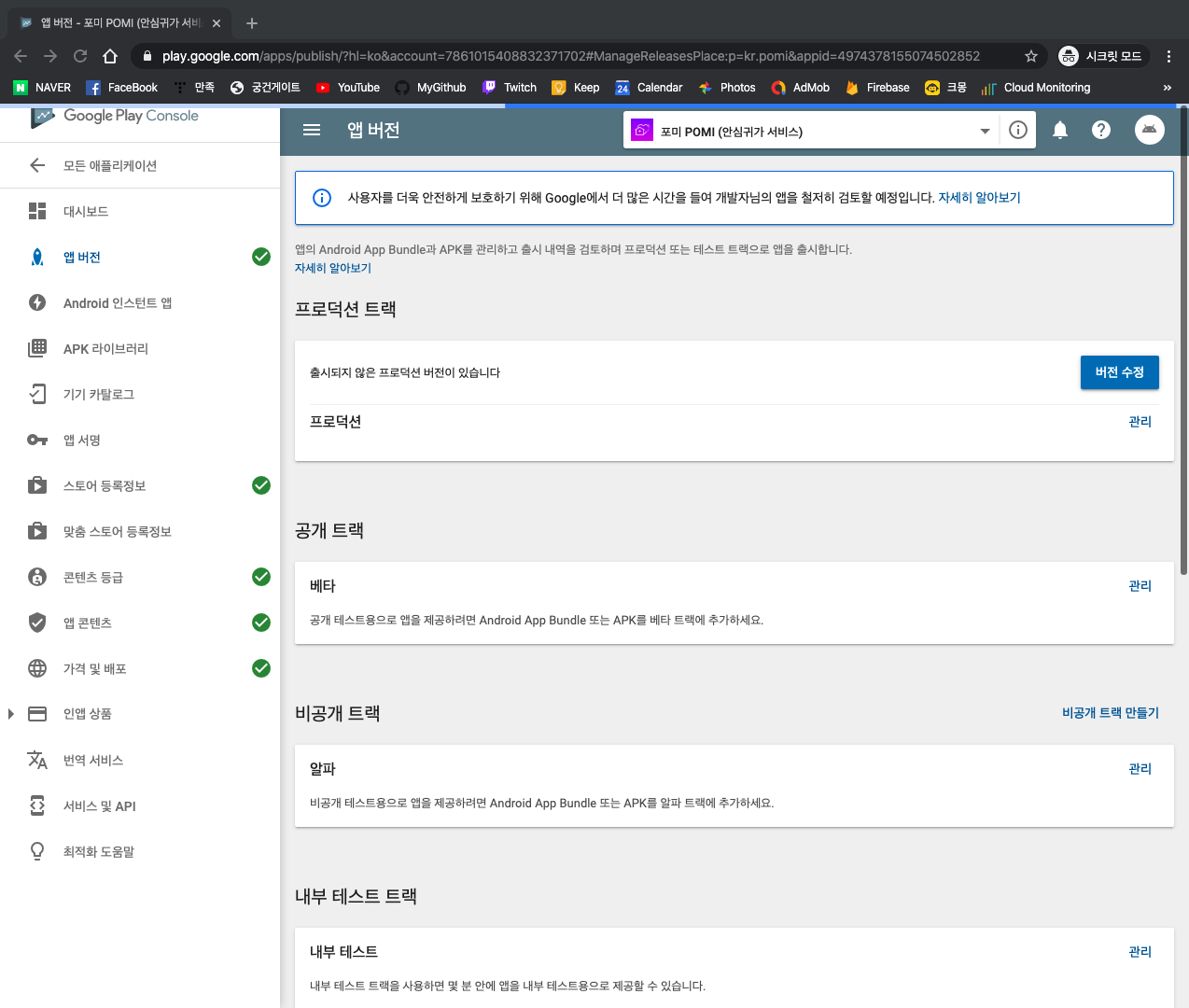 아직 왼쪽에서 콘텐츠 등급, 앱 콘텐츠, 가격 및 배포를 작성하지 않았기 때문에 출시 가능한 상태는 아니다.