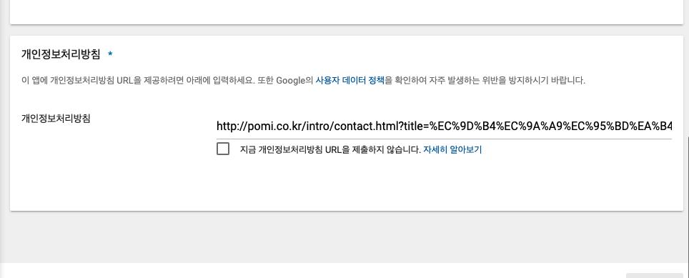 이 부분이 처음엔 귀찮아서 '지금 개인정보처리방침 URL을 제출하지 않습니다'로 체크하고 잊는 경우가 있는데