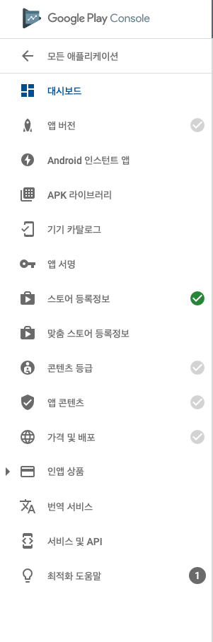 체킹표시된 아이콘이 모두 초록색이 되어야 마켓에 출시할 수 있는 상태가 된다.