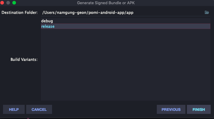 마켓에 올릴 것이므로 release를 선택하고 FINISH를 누른다.